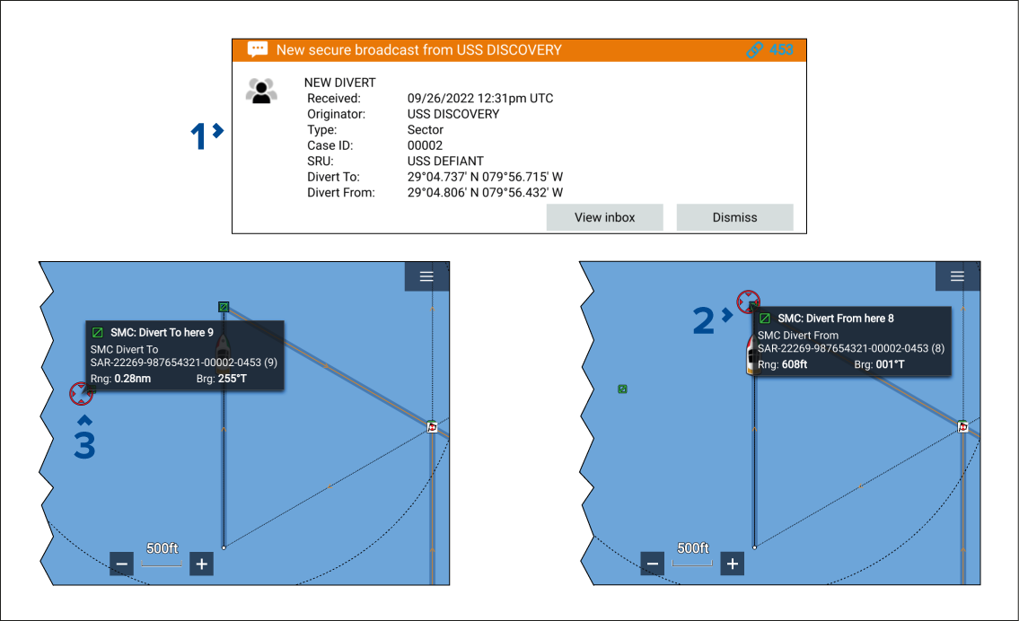 SAR DivertSAR SMC instructed divertWhen an instruction to divert is received, a notification is displayed onscreen and a “Divert to” marker is shown in the Chart app.