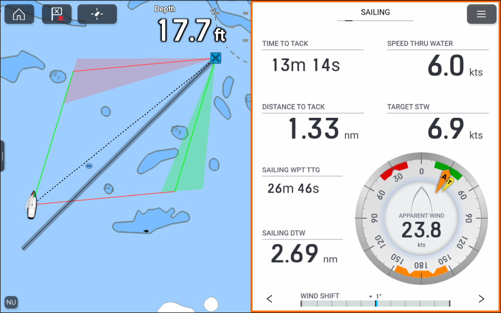 Sailing data and dials are available for display alongside laylines to help indicate which direction to turn in order to maximize your VMG (Velocity Made Good) to windward.