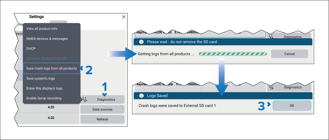 System logs and crash logs can be saved to memory card so that if requested by Technical support during troubleshooting they can be sent to Raymarine.