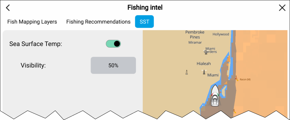 SiriusXM sea surface temperature layer options are available from the Fishing intel menu: .