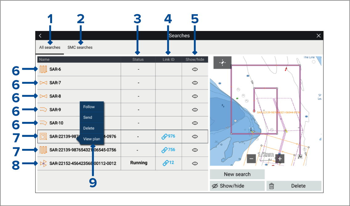 SAR Searches listThe searches list can be accessed from the Chart app menu: , or from the My Data menu: . When accessed from the chart app, the LiveView pane will be displayed and the Show on chart options are available.