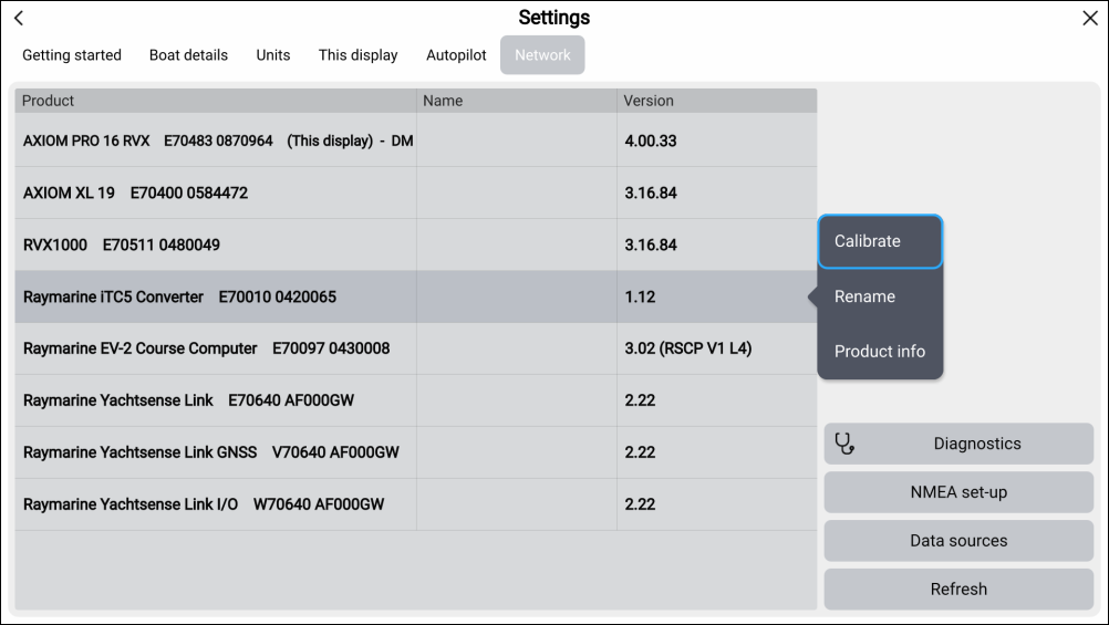 To calibrate instrument transducers, find the relevant iTC-5 from the list of devices connected to your MFD’s network.