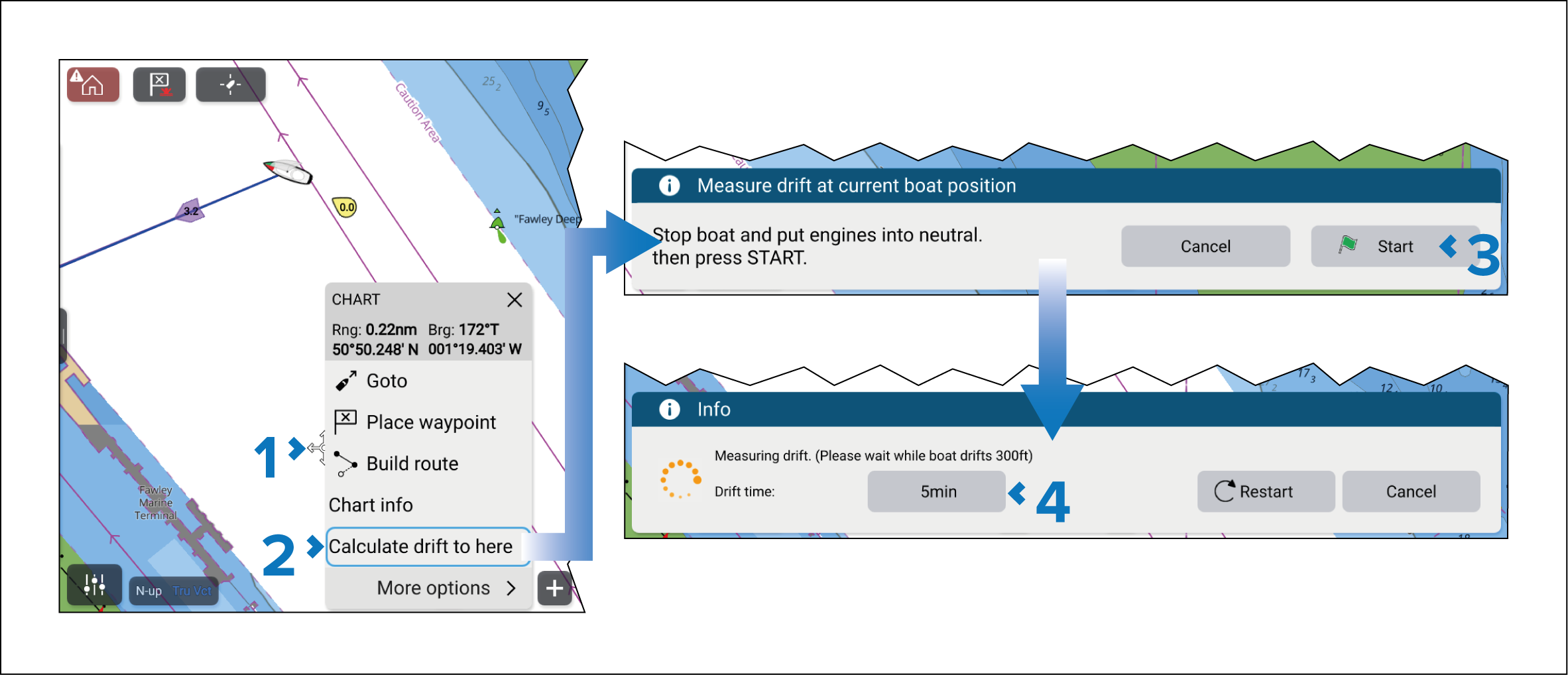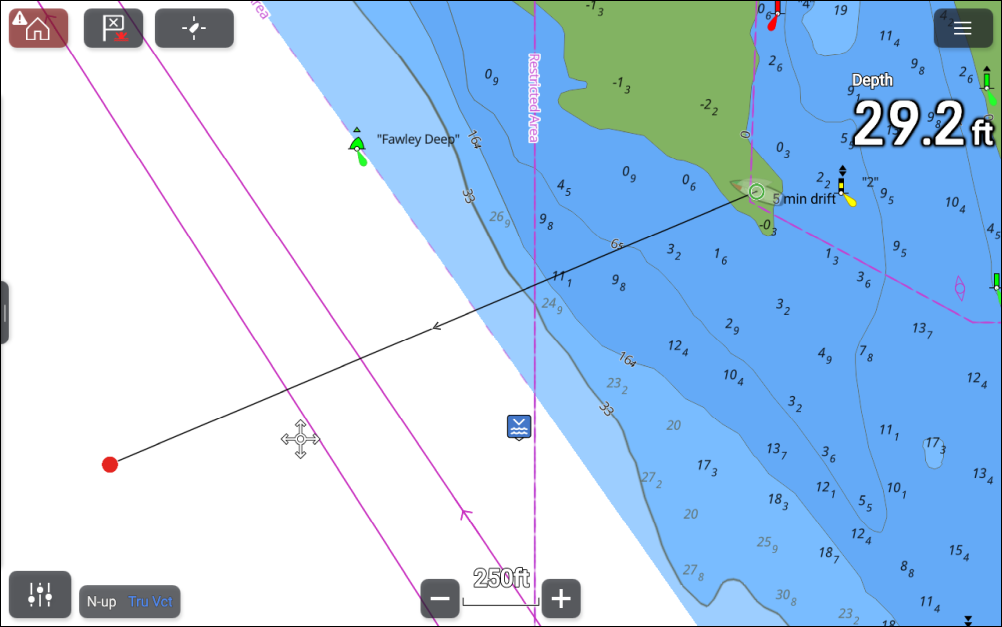 You should now position and align your boat with the transparent boat icon. If wind and tide conditions remain unchanged, you should be over the stop point once the specified drift time has elapsed.