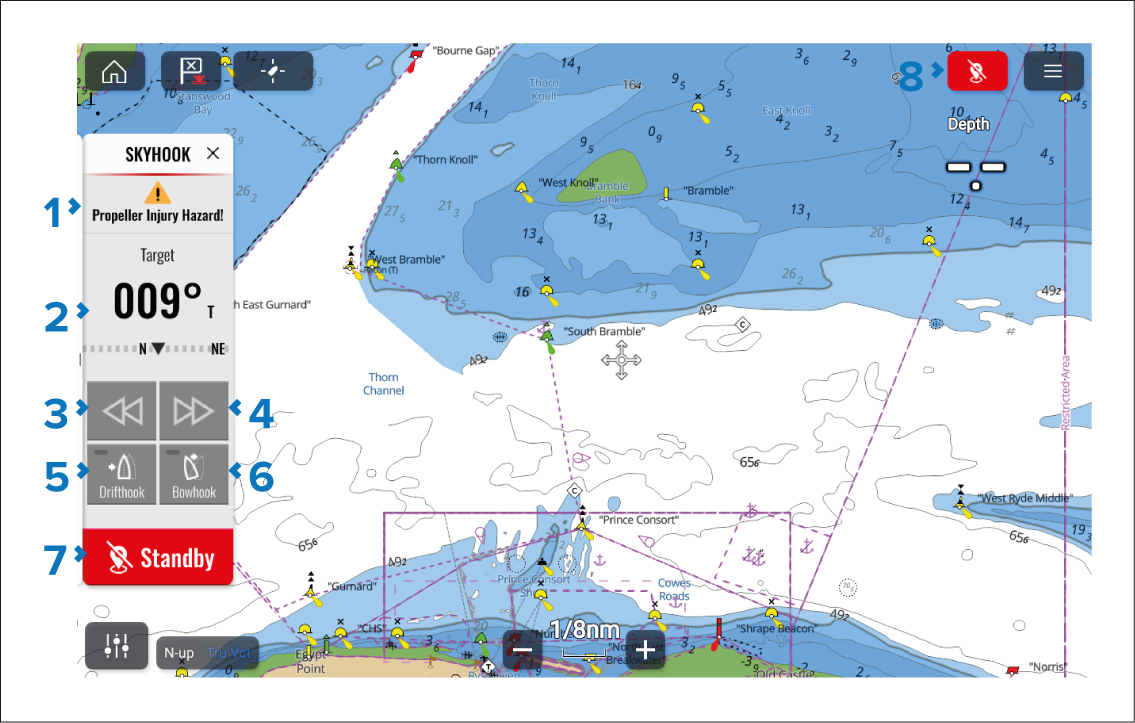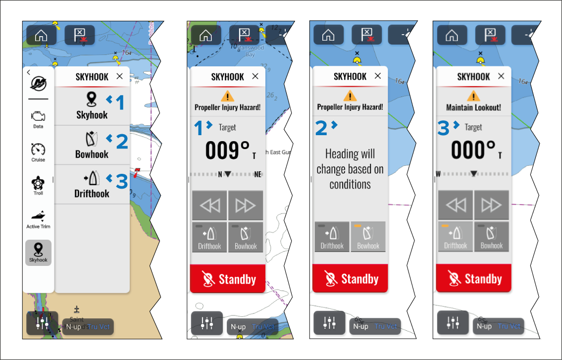— Selecting Standby disengages Skyhook mode.Skyhook icon — Selecting the Standby icon located in the top right of the Chart app will also disengage SkyHook mode.