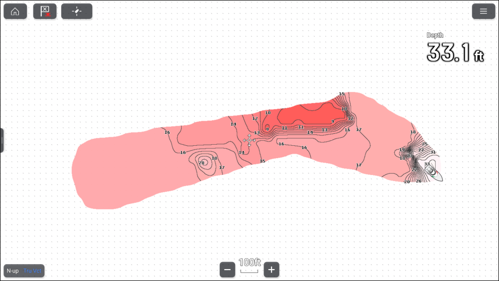 When using the SonarChart™ Live feature, new contour lines are drawn in realtime on the screen based on your transducer’s depth readings. Color shading is used to reflect contour depths. The bathymetry data is recorded to your Navionics chart card. Bathymetry data can be uploaded to the Navionics® website so that the contours can be shared.