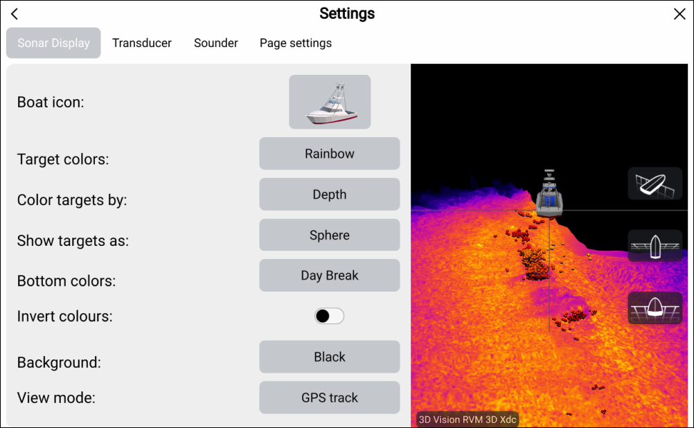 Fishfinder Boat iconBoat icon: — select the icon that is used to represent your vessel’s position. There are 4 vessel types to choose from.