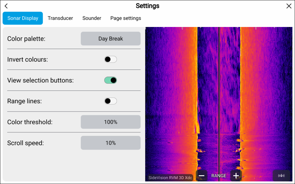 Fishfinder Range linesRange lines: — select to enable and disable onscreen vertical lines to represent range from your vessel.