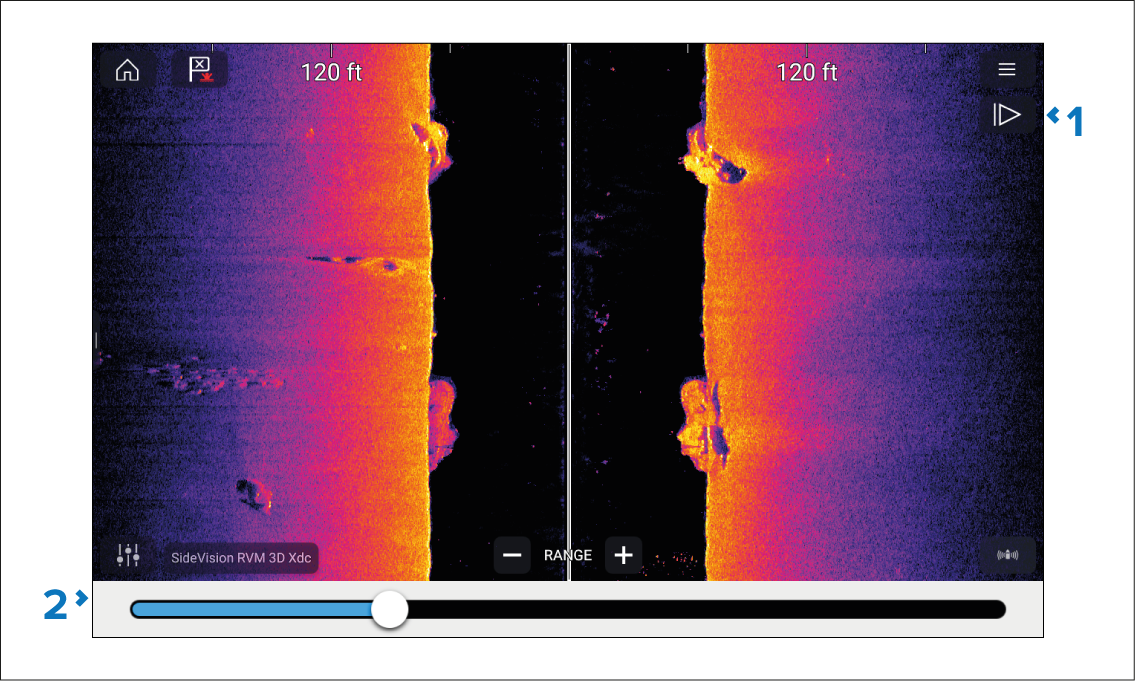 Scroll back bar — Use this to move back and forward through the available sonar history. You can either drag the position indicator right or left or select a specific location on the bar to jump to that position.