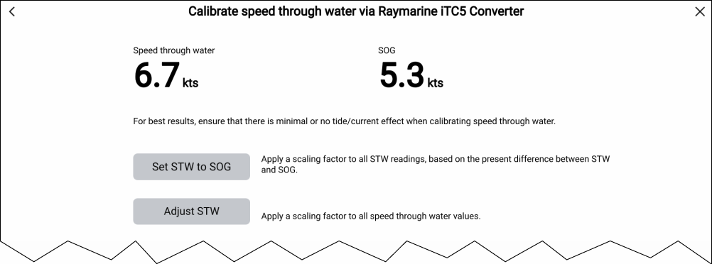 Speed Set STW to SOGSet STW to SOG — Select to apply a scaling factor to all STW readings, based on the present difference between STW and SOG.