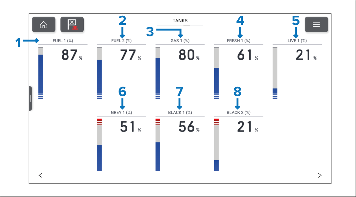 The tanks data page is always available. The number of tanks displayed is based on the number of each type of tank selected during the initial MFD start up wizard. The tanks page shows the capacity remaining for each tank.
