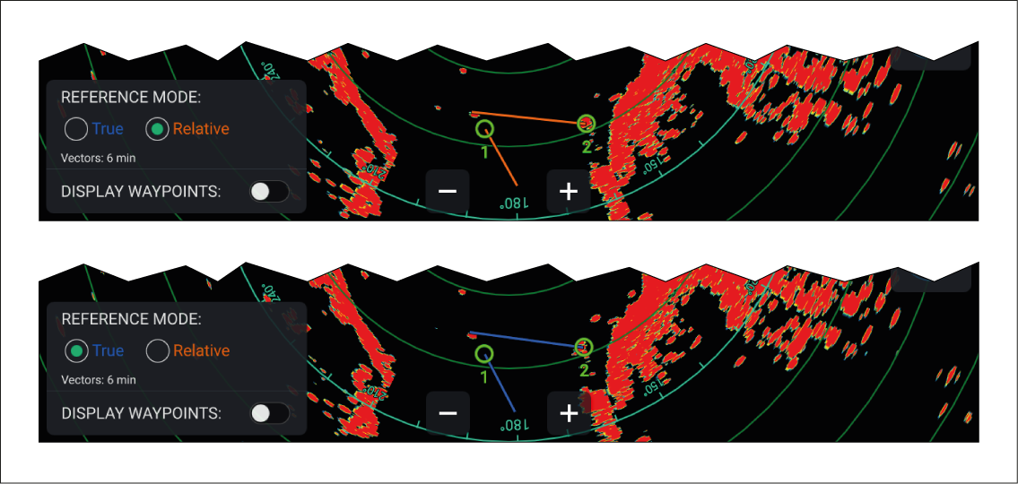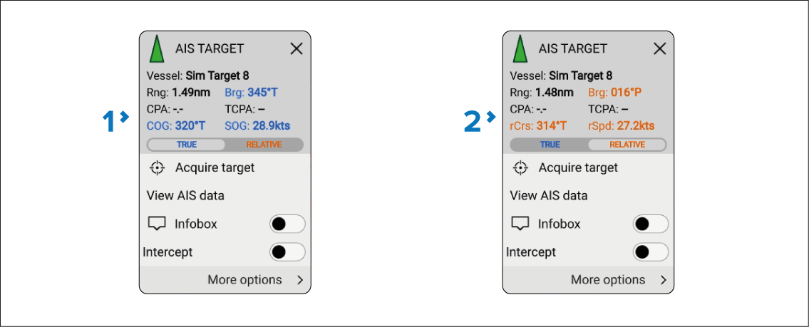 Selecting either True or Relative from the Quick adjust menu will switch the reference data for all AIS and Radar targets.