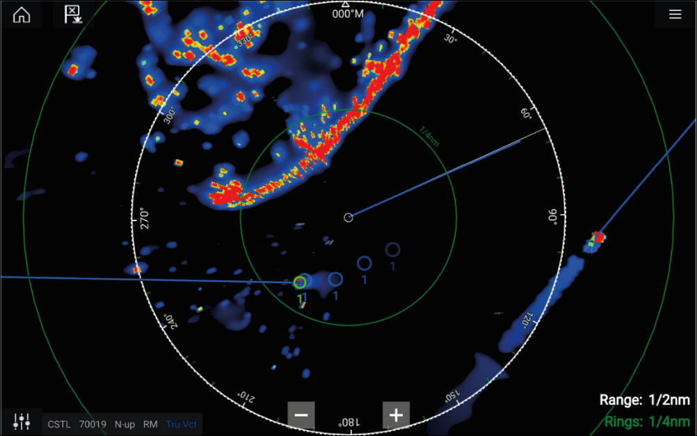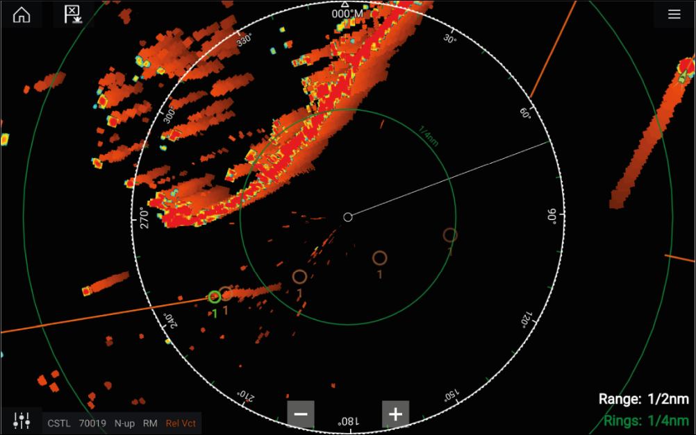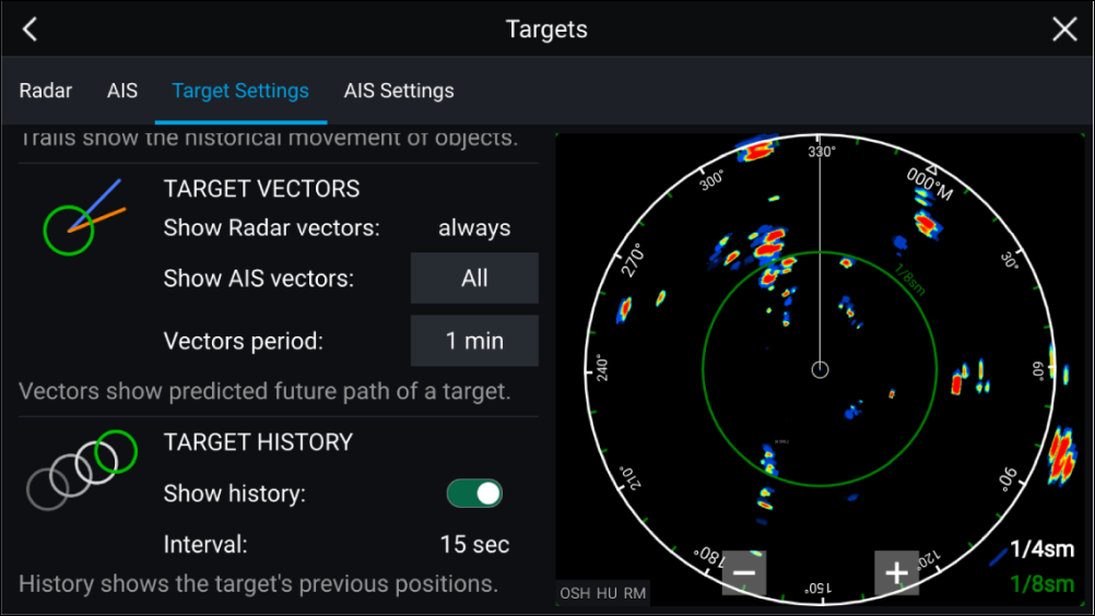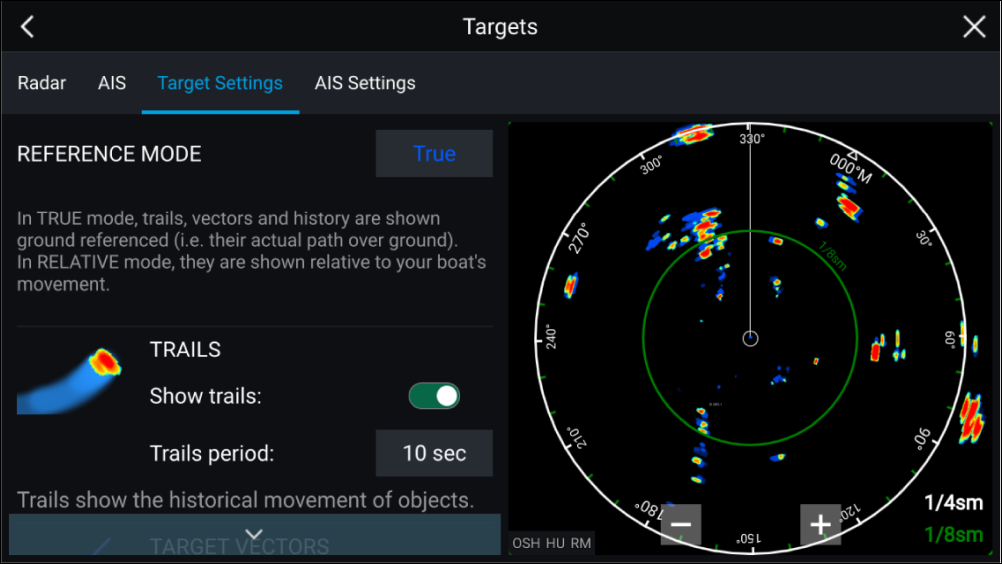 Radar targetReference modeRelative modeTrue modeTarget settings can be configured to either True or Relative mode. In True mode, Trails, Vectors and History are colored Blue and are shown ground referenced (i.e. the object or target’s actual Course Over Ground (COG)). In Relative mode, Trails, Vectors and History are colored Orange and are shown relative to your vessel’s movement.