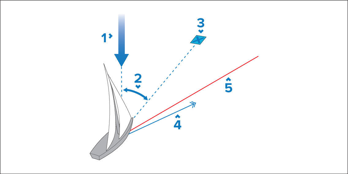 When the chartplotter’s Sail performance is set to Polar and the wind angle is within 30° of the polar target wind angle, the vessel will automatically steer towards the relevant TWA based on current True Wind Speed (TWS) for vessel speed, as specified in your polar table. The upwind or downwind, port or starboard target wind angle is used, depending on which is closest to the current wind angle.