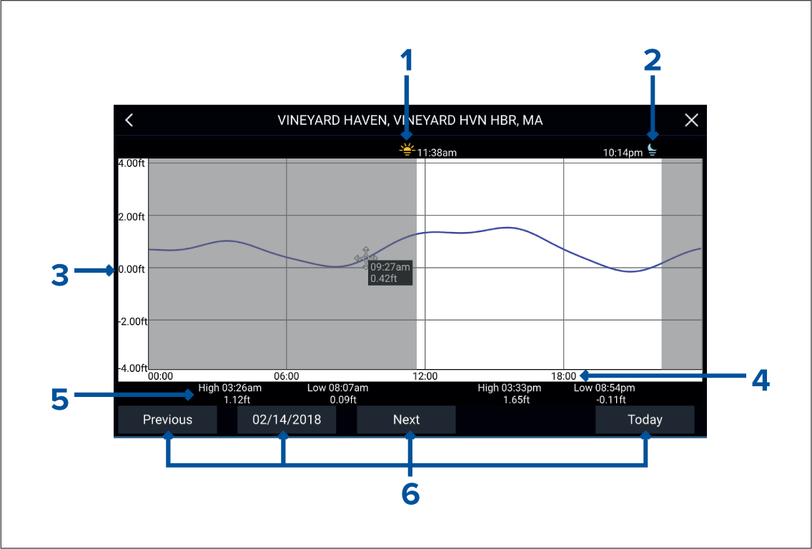 Time and date options — Use the buttons to view previous, next or today’s tide predictions, or enter a date by selecting the date field.