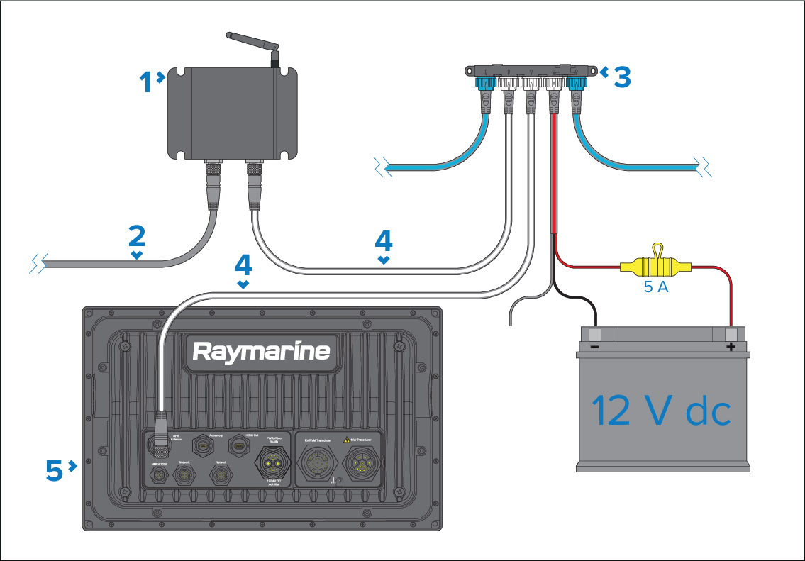 The diagram depicts connection using a Raymarine SeaTalk NG network. A DeviceNet network could be used in a similar way.