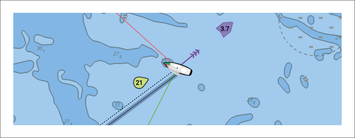 When the destination waypoint is upwind and the layline has not been reached, the laylines will be displayed as a parallelogram. Green lines represent starboard tack and red lines represent port tack.