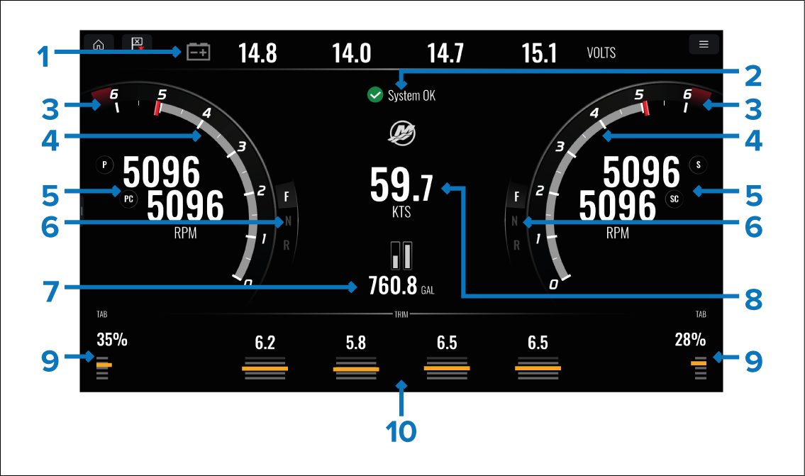 Engine trim — Indicates the engine trim position. Numeric values will be displayed between 1 and 10. Although the highest numeric value is 25, values above 10 are not displayed and are instead replaced by an icon, to indicate that the boat is being trailered.
