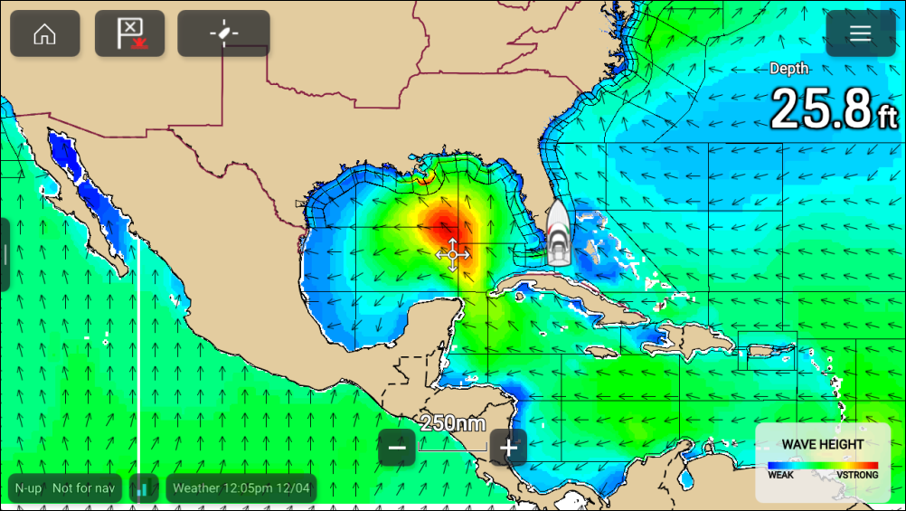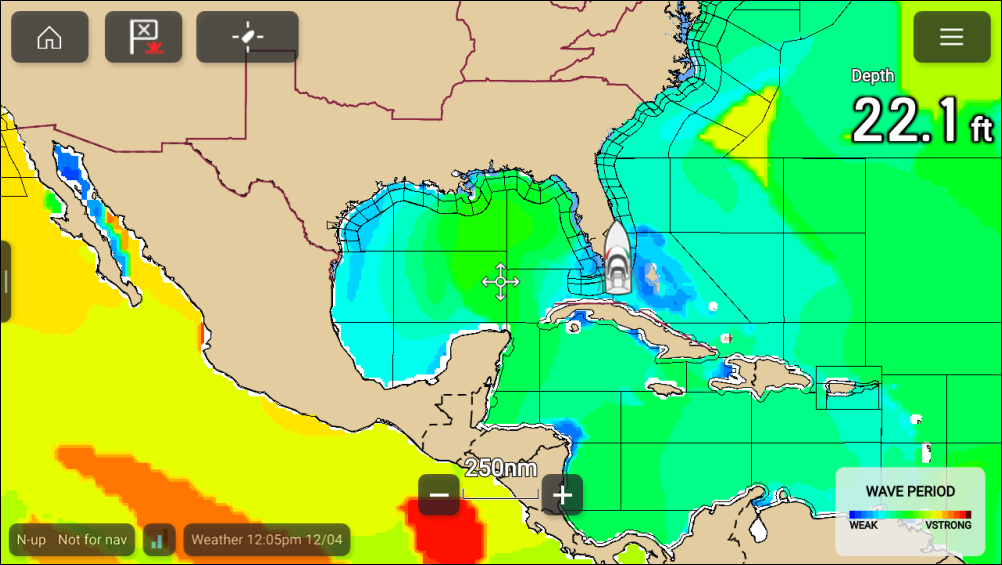 The wave direction layer uses arrows to identify the direction waves are travelling. The wave height layer uses color coding to identify the height of waves, the wave period layer also uses color coding to identify the gap between waves. A legend is available that can be displayed onscreen to aid identification of wave height and wave period.