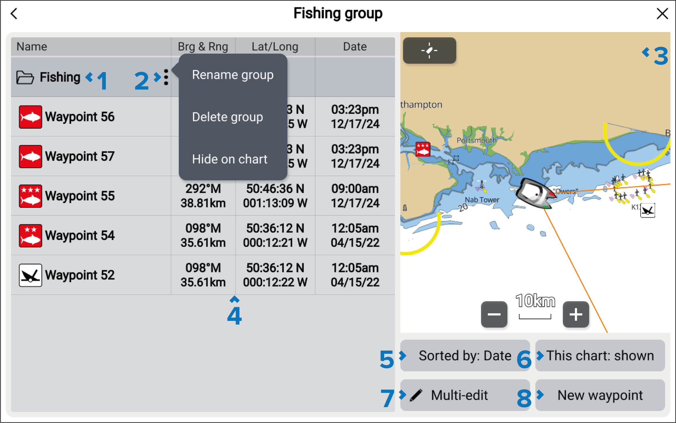 Hide on chart / Show on chart — when the waypoint list is accessed via the Chart app, this option allows you to show or hide the waypoints in the group. Hidden groups will not be displayed in the Chart app.
