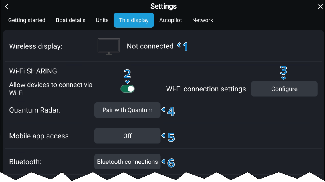 Wi-Fi and wireless connection settings are provided in the This display settings menu.