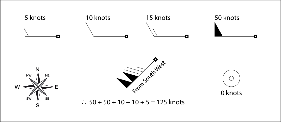 Weather modeWind directionWind speedWind arrowsThe direction of the arrows indicates the wind direction and the size of the arrow indicates wind speed, the larger the arrow the greater the wind speed. Where conditions are calm a circular symbol is used.