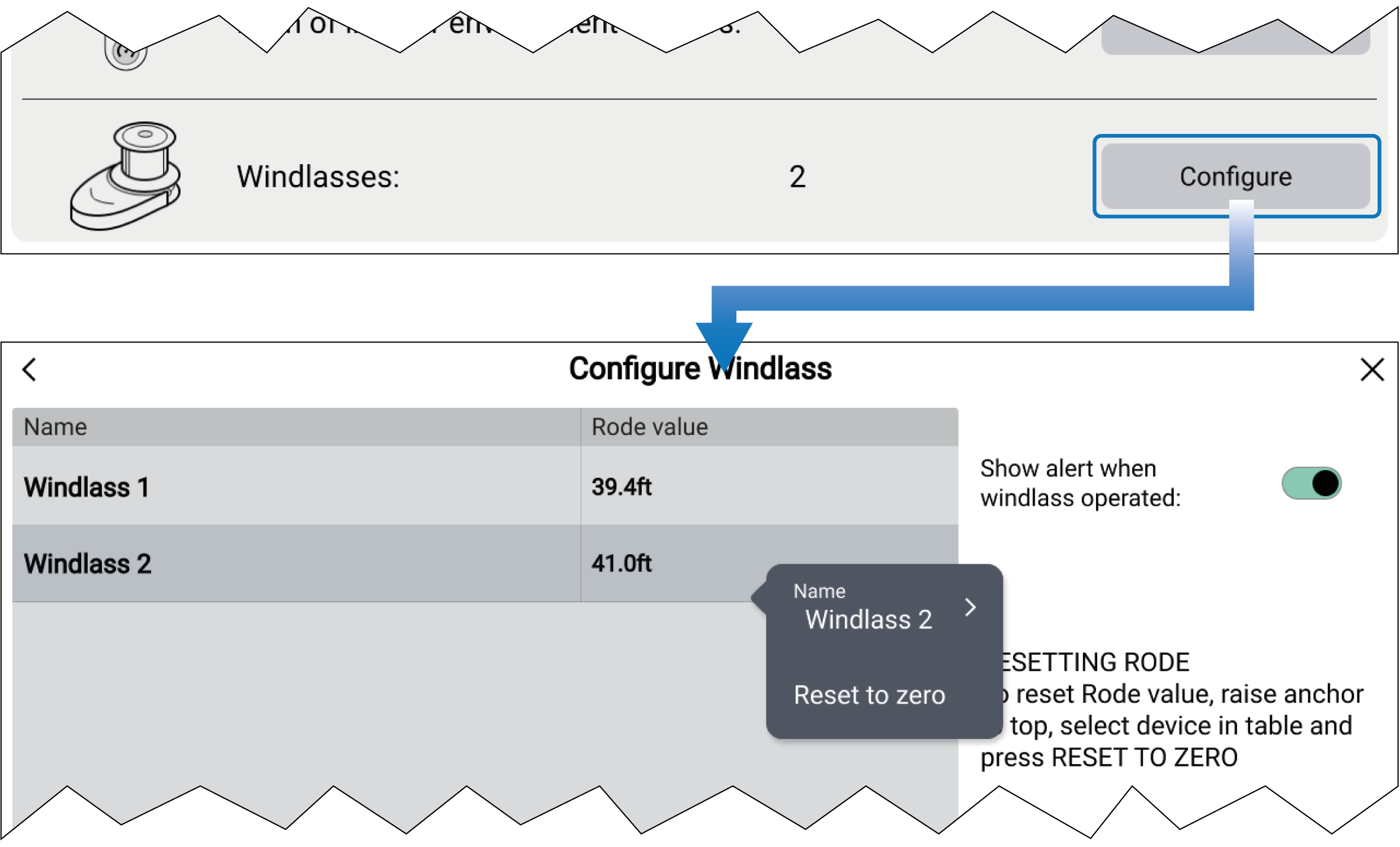 From the Pop-over menu, you can rename the selected Windlass by selecting its name, or reset the current Rode value by selecting Reset to zero.