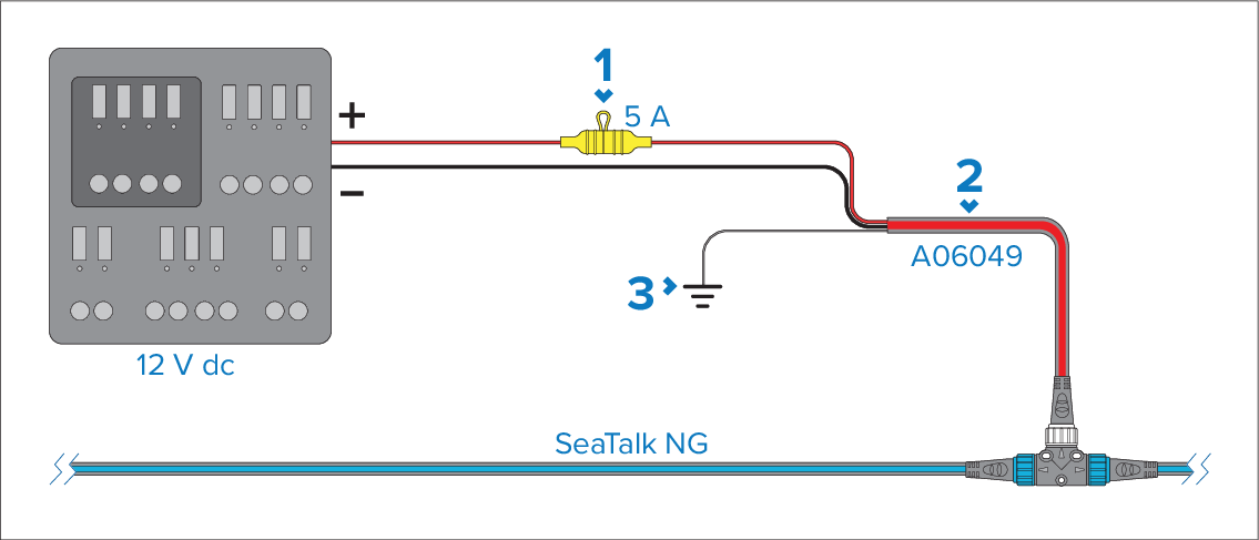 ConnectionsDistribution panelPowerDistribution panelIdeally, the SeaTalk NG power cable should be connected to a suitable breaker or switch on the vessel's Distribution panel connection distribution panel or factory-fitted power distribution point. It is recommended that a 5 A inline fuse is fitted to the red (positive) wire of the SeaTalk NG power cable.