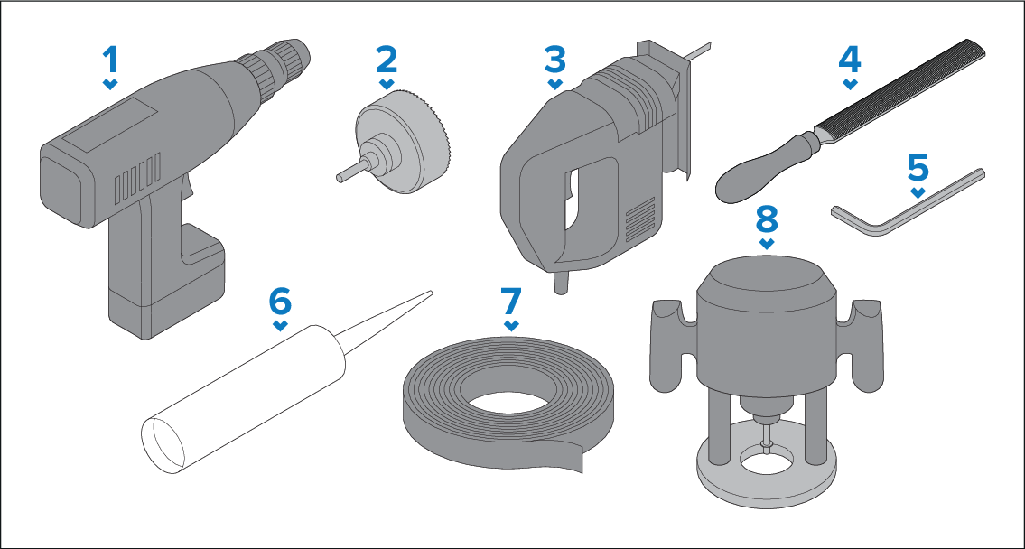 - Hole cutter (appropriate size for corner diameters of the Cut out line identified on the supplied mounting template):