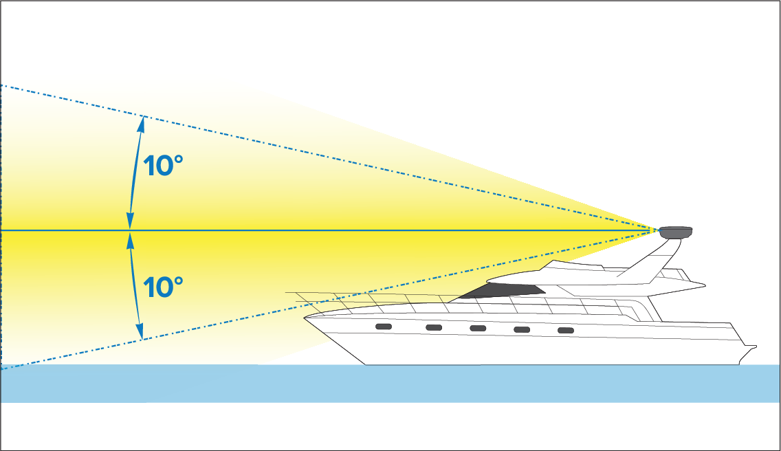 The Radar beam from the Radar scanner is approximately 20° wide in the vertical direction, to give good target detection even when your vessel pitches and rolls.
