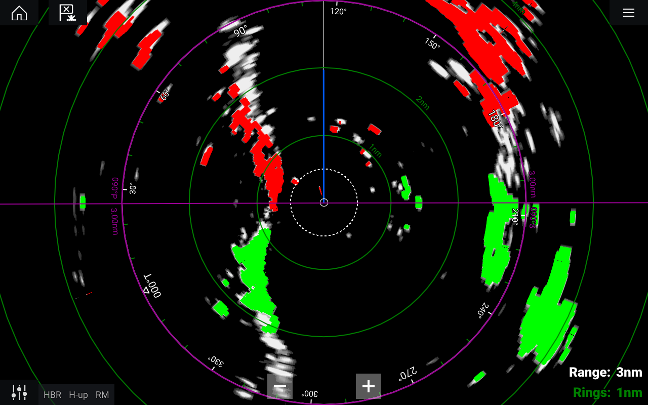 Stationary targets such as land are colored red or green when under way: ![]() |