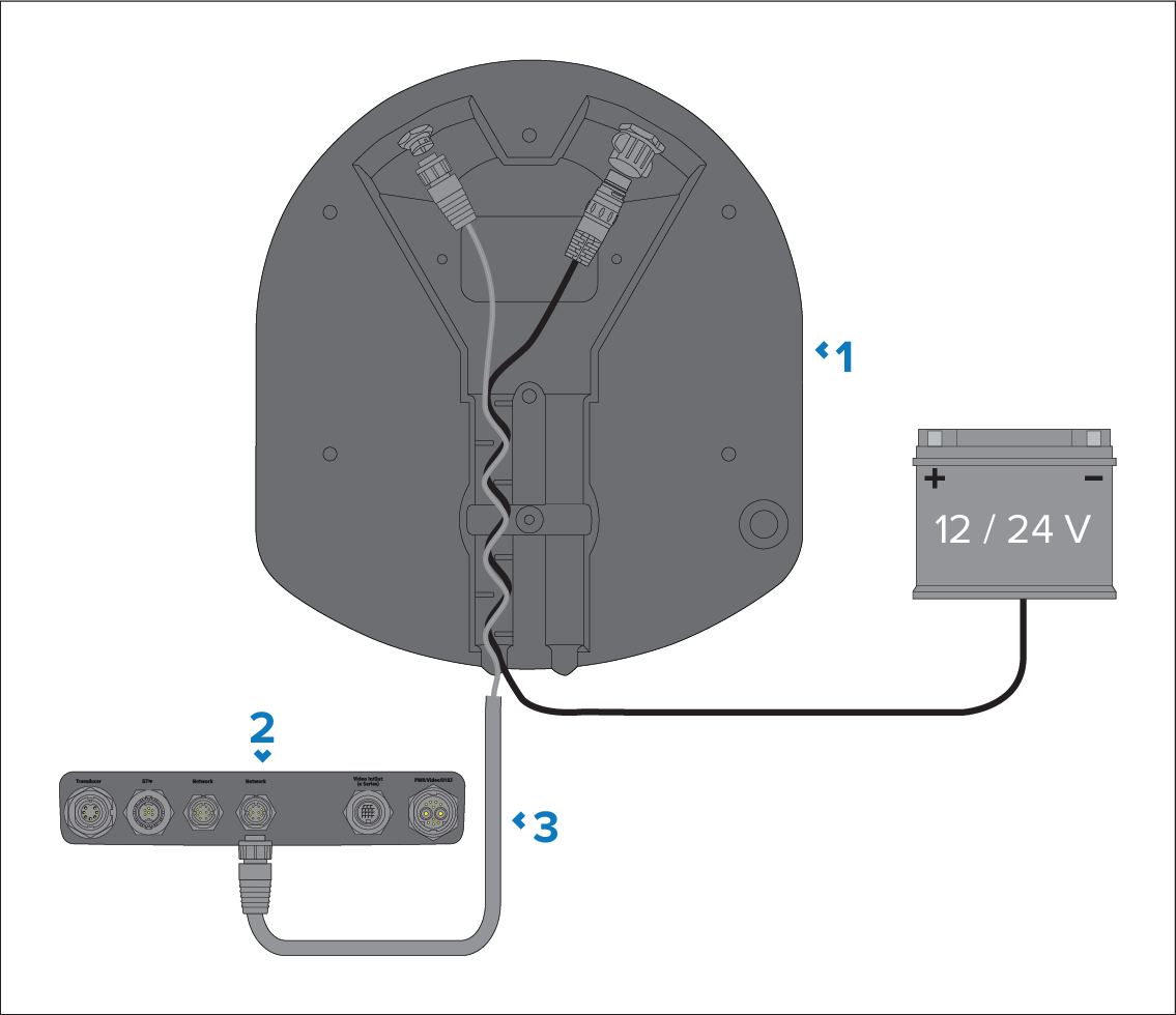 Radar scanner connected to a multifunction display using a RayNet cable.