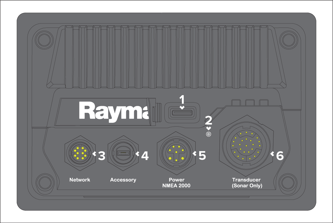 (1) Transducer (Sonar Only) — Connects to a compatible RealVision 3D transducer (or other compatible transducers via the use an adaptor cable). For more information, refer to: Transducer connections