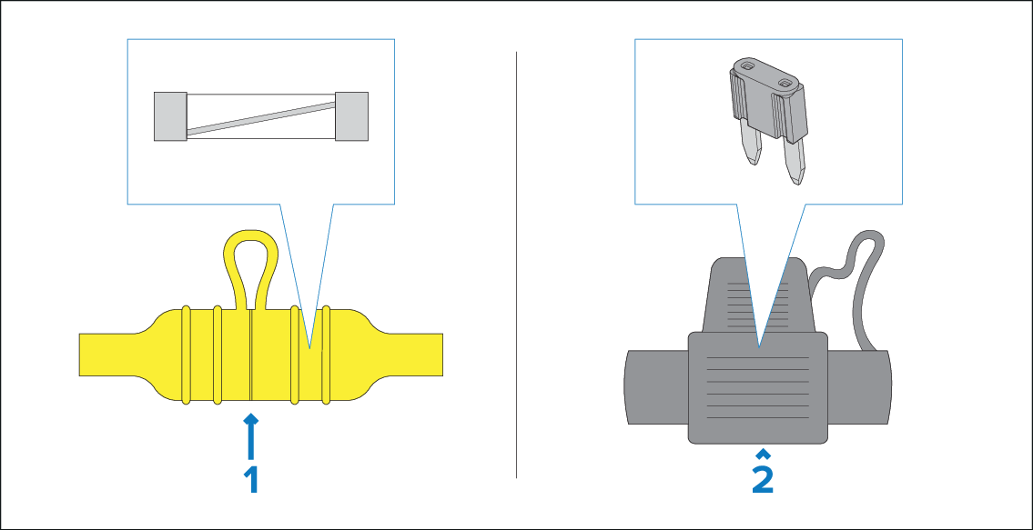 The illustration below shows the two main types of inline fuse with waterproof holder, for use in marine electronics installations. Fuses in a variety of ratings are widely available at chandleries and marine electrical retailers.