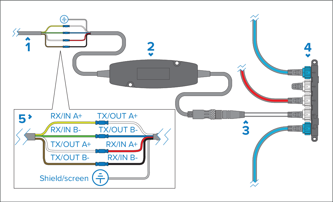 Connect the converter to your NMEA 2000 or SeaTalk NG network, using either a DeviceNet to SeaTalk NG adaptor cable, or a DeviceNet cable as appropriate. Then, connect the converter’s NMEA 0183 bare wires to the relevant wires on your NMEA 0183 device, and crimp and insulate the wires.