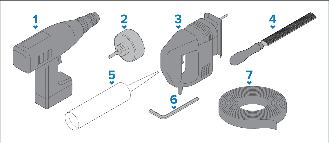 - Hole cutter (appropriate size for corner diameters of the Cut out line identified on the supplied mounting template):