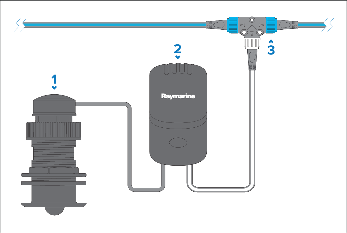 Connect the pod to the SeaTalk NG backbone using a SeaTalk NG to bare wire spur cable (e.g.: A06043) and a T-piece connector. Pods must be located no farther than 400 mm (15.75 in.) from the connection point on the backbone.