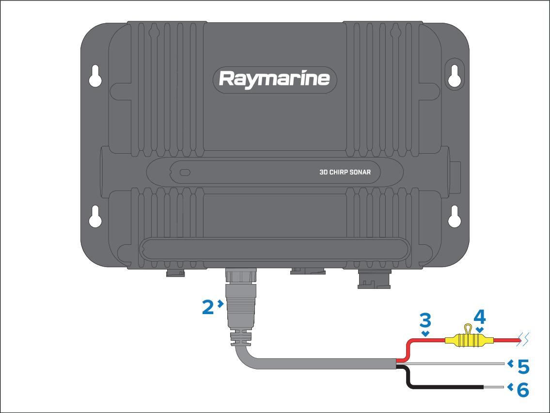 The sonar module is supplied with a power cable which contains bare stripped wires, suitable for direct connection to a 12 V or 24 V power supply:
