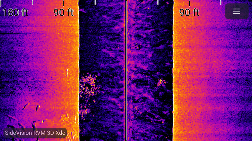 SideVision® is effective at lower vessel speeds. The wide, thin beams produce clear target returns. As your vessel moves forward, subsequent returns build up to provide an image of the sea floor on each side of your vessel.