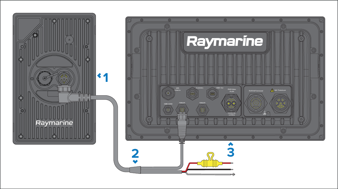 In order to function, your performance display must be networked to a compatible multifunction display / chartplotter via a separately available 8-pin right-angled power to RayNet and bare end power wires cable.