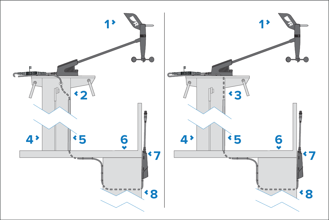 To keep the size of any holes that need to be drilled for cable routing to a minimum, route the mast cable from the transducer location using the bare wire end first.